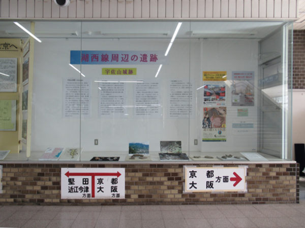 JR湖西線大津京駅の改札内コンコース(改札口正面)の展示スペースで、様々な展示を行っています。電車を待つちょっとした時間でも、地域の文化財に対する理解が深まります。気軽にお立ち寄りください。